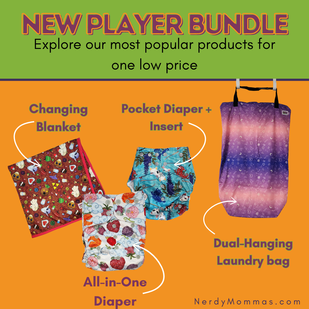 The New Player Bundle is back and better than ever! Now you can sample our Best selling cloth diapering products for one low price. This bundle comes with everything you need to learn about different diapering styles, including some essential accessories. Explore your diapering options with a pocket diaper and an all-in-one diaper so you can learn what works best for you and your journey. If you would like to request specific prints, please include a note in your order at checkout, otherwise prints will be chosen at random.