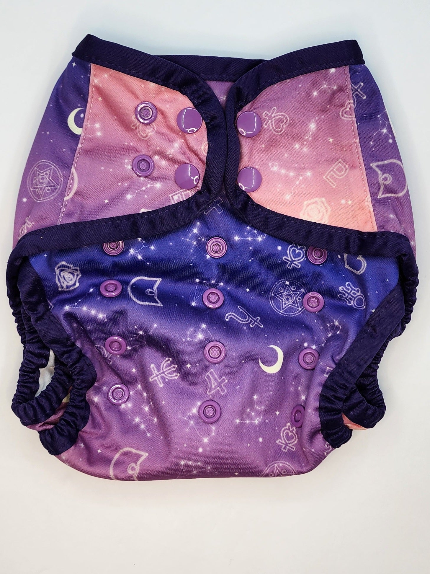 The Nerdy Mommas cloth diaper cover is a waterproof diaper shell with a wipeable interior..A cover has no absorbing or wicking layers, so they can easily be washed and dried. All Nerdy Mommas diapers feature an extra set of crossover snaps on the tabs to make closing up a soiled diaper quick and easy.