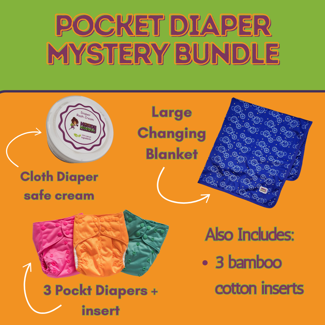 Get ready for an amazing deal with our pocket diaper mystery bundle! This exclusive bundle includes three high-quality cloth diapers, 3 cotton bamboo inserts, a changing blanket and a cloth diaper safe rash cream.